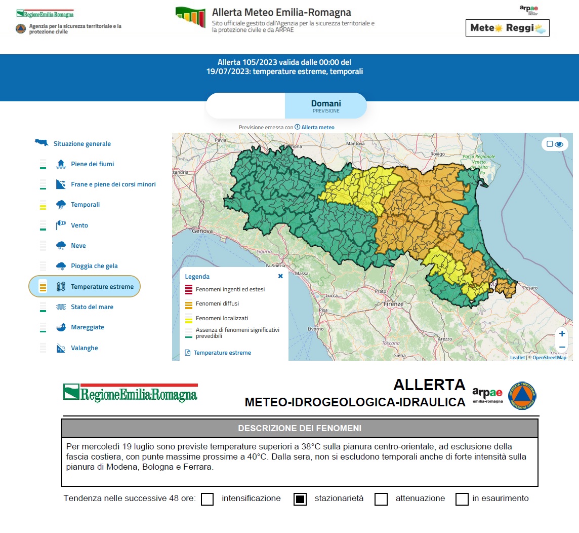 Ancora caldo estremo con valori che a nord della via Emilia potrebbero toccare i 38°C in diverse stazioni. Secondo molti modelli sul finire del pomeriggio potrebbe svilupparsi una vivace attività temporalesca. Non abbiamo allerta meteo, ma ugualmente prestiamo attenzione a questa fase perché non è detto che qualcosa non transiti anche da noi con rischi di forti raffiche di vento in uscita dai fronti e qualche evento grandinigeno.