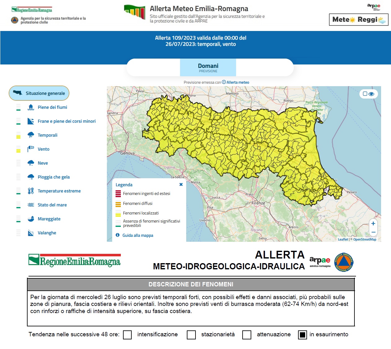 Anche per la giornata di mercoledì 26 è lecito attendersi degli eventi minacciosi perché l'energia sarà ancora tanta e perché gli ingredienti principali per violenti temporali ci saranno tutti. Per tale ragione è stata emessa un'allerta meteo 🟡 "Gialla" dall'Agenzia per la sicurezza territoriale e la protezione civile e da ARPAE.