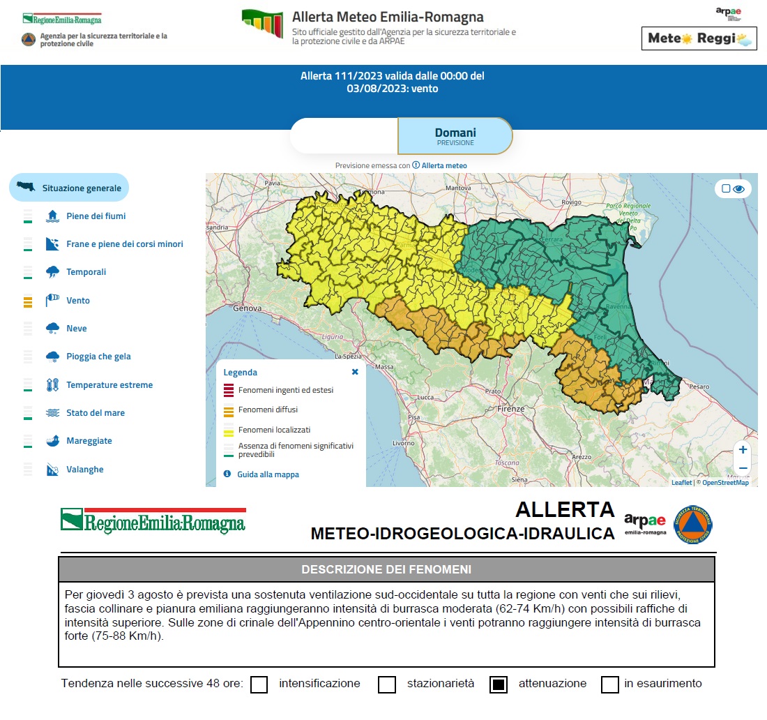Giovedì 3 agosto, infatti, sarà una giornata segnata dal transito di forti raffiche di vento in caduta dal nostro Crinale. Un vento caldo di Favonio che asciugerà l'aria dall'umidità e che al tempo stesso è all'origine dell'allerta meteo emessa dall'Agenzia per la sicurezza territoriale e la protezione civile e da ARPAE che raggiungerà livello 🟠 "ARANCIONE" su parte della nostra Provincia.