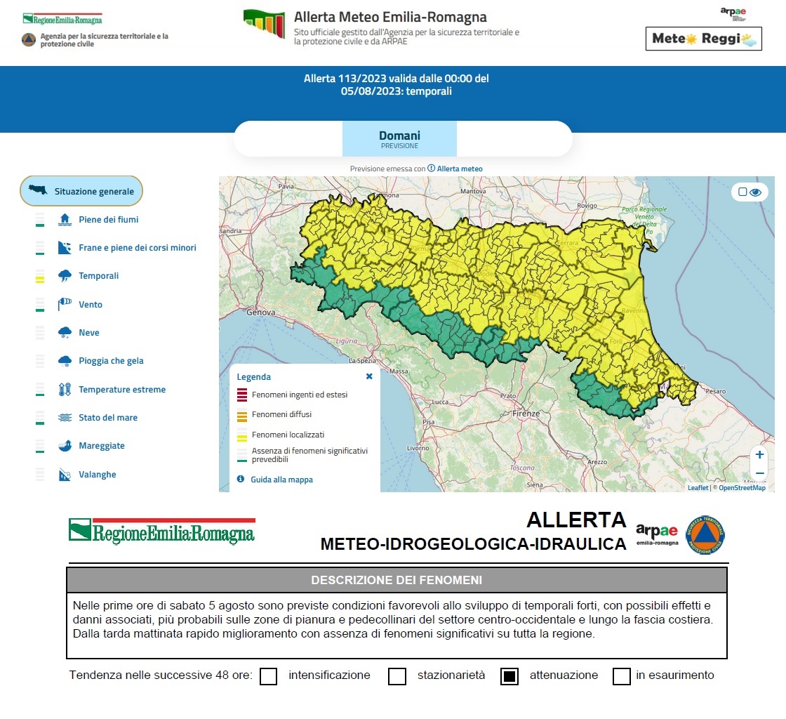 Per tale ragione è stata emessa dall'Agenzia per la sicurezza territoriale e la protezione civile e da ARPAE, un'allerta meteo 🟡 "Gialla" valida per la giornata di sabato 05 agosto e che si somma a quella già in vigore per oggi, venerdì 04.