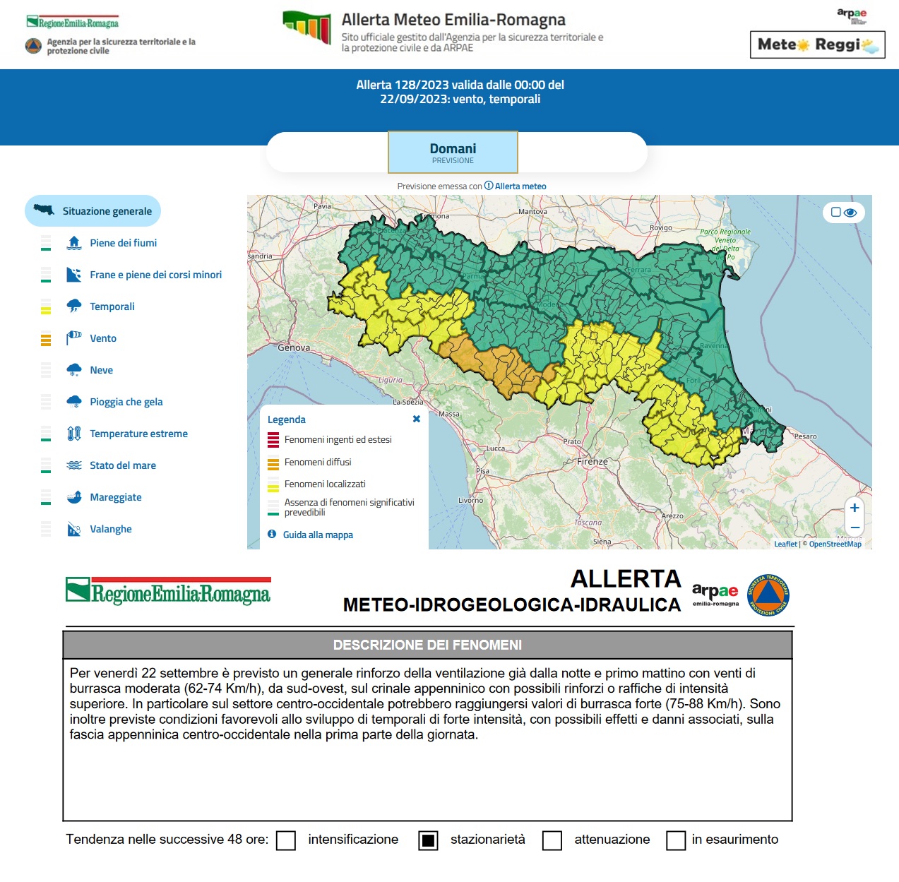 Per tale ragione è stata emessa per la giornata di domani, venerdì 22 settembre, un'allerta meteo 🟠 "Arancione" dall'Agenzia per la sicurezza territoriale e la protezione civile e da ARPAE