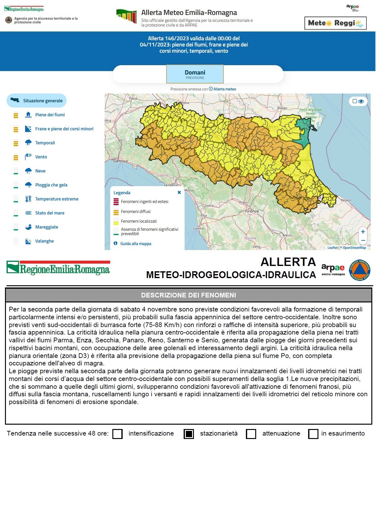 Anche la giornata di domani, sabato 04 novembre, vedrà un ritorno del maltempo sulla nostra Provincia. Per tale ragione è stata emessa questa mattina dall'Agenzia per la sicurezza territoriale e la protezione civile e da ARPAE una nuova allerta meteo 🟠"Arancione"