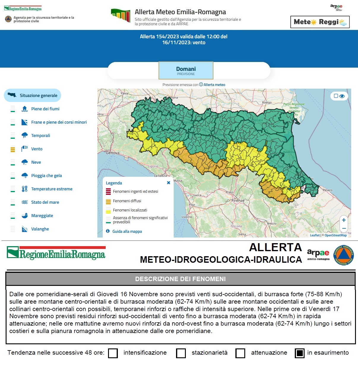 Anche tra la via Emilia e l'alta Collina non abbiamo allerta meteo. Il vento si rinforzerà progressivamente nel corso del pomeriggio con raffiche forti o moderate a ridosso del tramonto. Attenuazione nel dopo cena, ma non sarà una ventilazione da richiedere un allertamento.