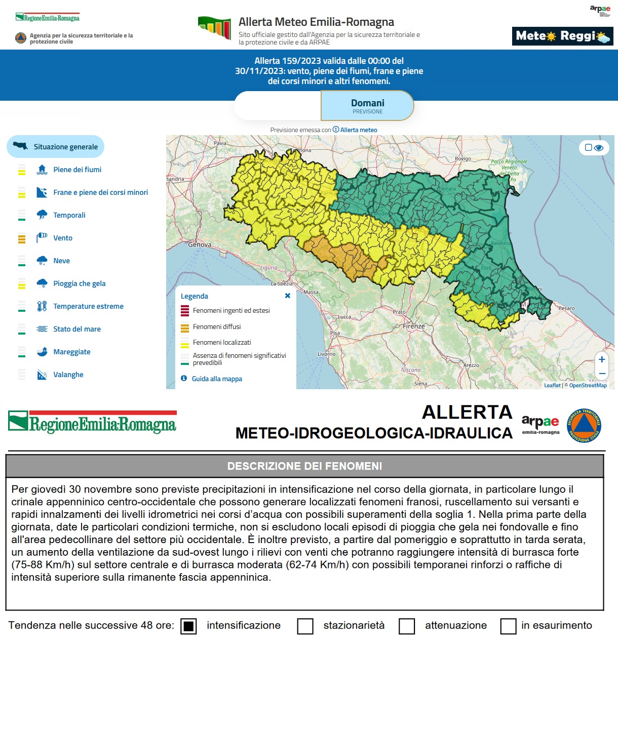 E' stata emessa pochi minuti fa, dall'Agenzia per la sicurezza territoriale e la protezione civile e da ARPAE, una nuova allerta meteo valida per la giornata di domani, 30 novembre, di livello 🟠 "Arancione" che interesserà la nostra Provincia.