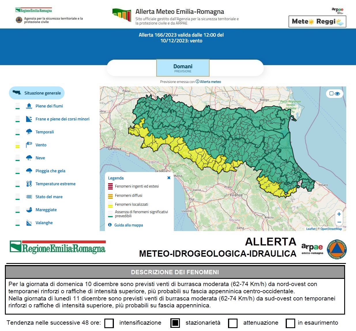 Su tutta la zona abbiamo allerta meteo "gialla" dalle 12:00 di domenica 10 dicembre per venti a regime di burrasca moderata (62-74 Km/h) da sud-ovest con temporaneirinforzi o raffiche di intensità superiore. Si raccomanda attenzione alla possibile caduta di oggetti esposti, rami o alberi pericolanti.