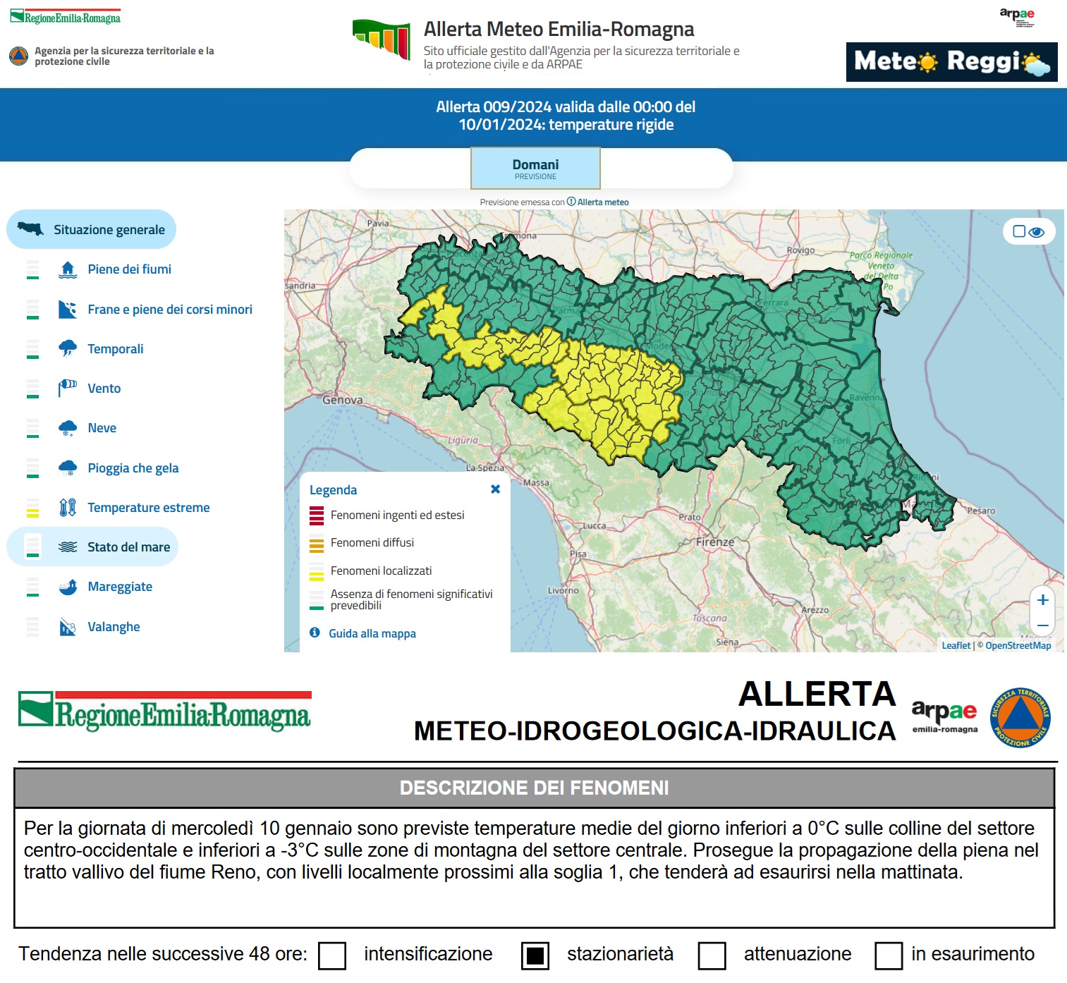 Su tutta la zona non abbiamo alcuna allerta meteo. Temperature minime al mattino che scenderanno sotto lo zero, soprattutto nelle campagne attorno a Reggio Emilia, ma non tali da giustificare un'allerta.