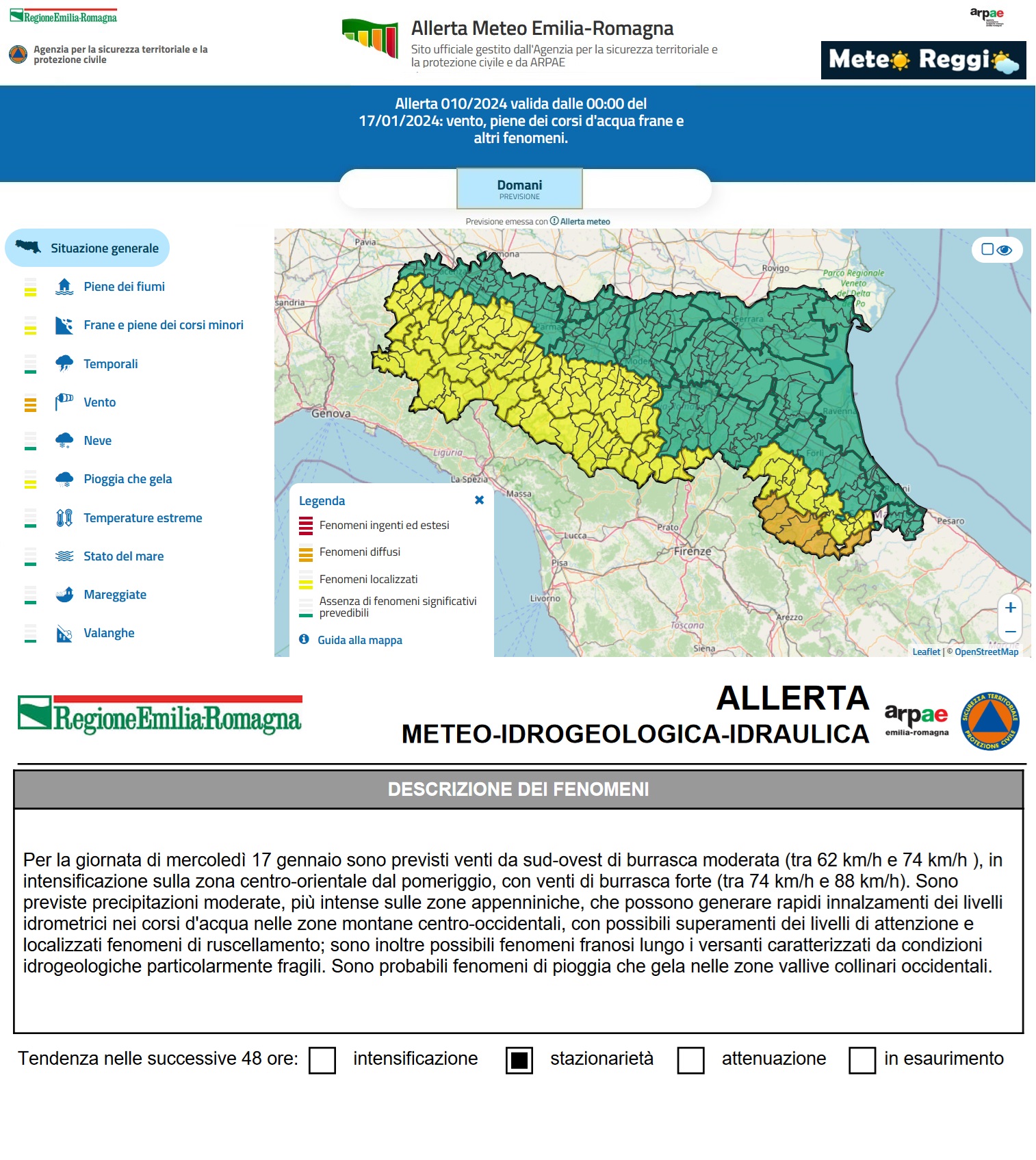 Per tale ragione è stata emessa per la giornata di domani, mercoledì 17 gennaio, dall'Agenzia per la sicurezza territoriale e la protezione civile e da ARPAE, un'allerta meteo 🟡 "gialla". Questa sarà valida solo su alcune parti della Provincia di Reggio Emilia, quindi vediamo bene il dettaglio: