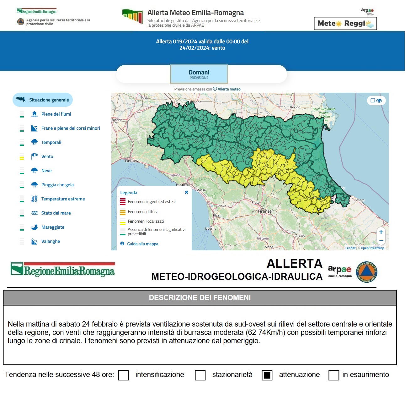 Per tale ragione è stata emessa per la giornata di sabato 24 febbraio una nuova allerta meteo da parte dell'Agenzia per la sicurezza territoriale e la protezione civile e da ARPAE.
