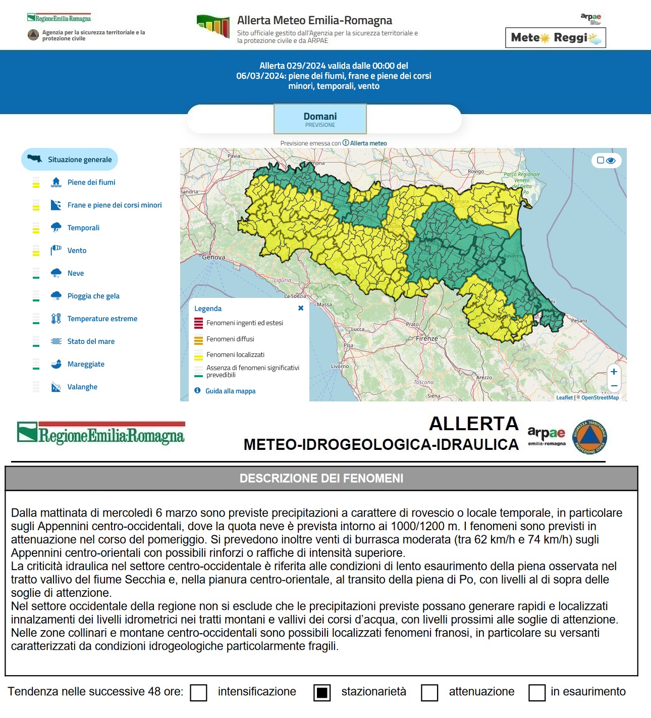 A queste possibili criticità si somma un terreno appesantito dalle piogge del week-end che potrebbe creare qualche problema. Per tale ragione è stata emessa dall'Agenzia per la sicurezza territoriale e la protezione civile e da ARPAE un'allerta meteo 🟡 "gialla" che interesserà tutta al Provincia nella giornata di Lunedì 11 marzo.