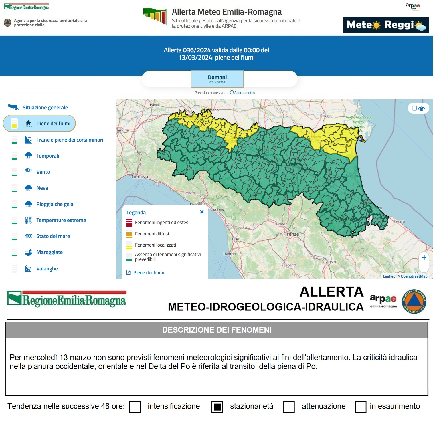 Questo cielo sereno tranquillizza tutti, ma è stata ugualmente emessa dall'Agenzia per la sicurezza territoriale e la protezione civile e da ARPAE un'allerta meteo 🟡 "gialla" per via del deflusso dell'onda di piena del fiume Po che transiterà questa sera nel reggiano e che manterrà alto il livello dell'acqua anche domani, mercoledì 13 marzo.