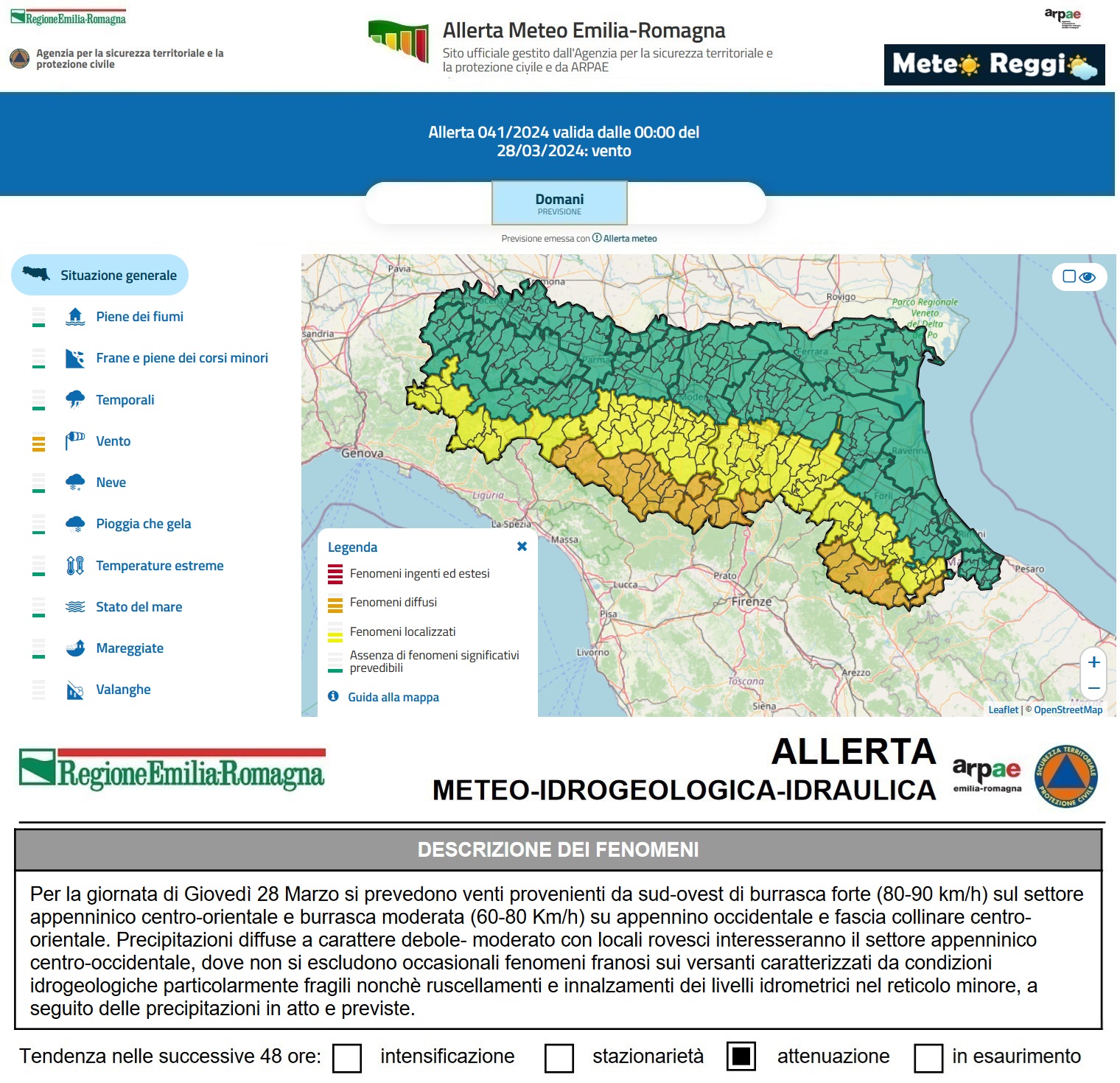 A sud della via Emilia avremo allerta meteo "gialla" per vento in caduta dall'Appennino. Ventilazione a regime di burrasca moderata (60-80 Km/h) che si presenterà dal tramonto di oggi e resisterà per tutta la giornata di giovedì 28 marzo, con momenti più intensi nella nottata tra i due giorni. Attenzione alla possibile caduta di oggetti esposti, rami secchi o alberi sulla rete stradale. Nuovo rinforzo delle raffiche in serata dal tramonto.
