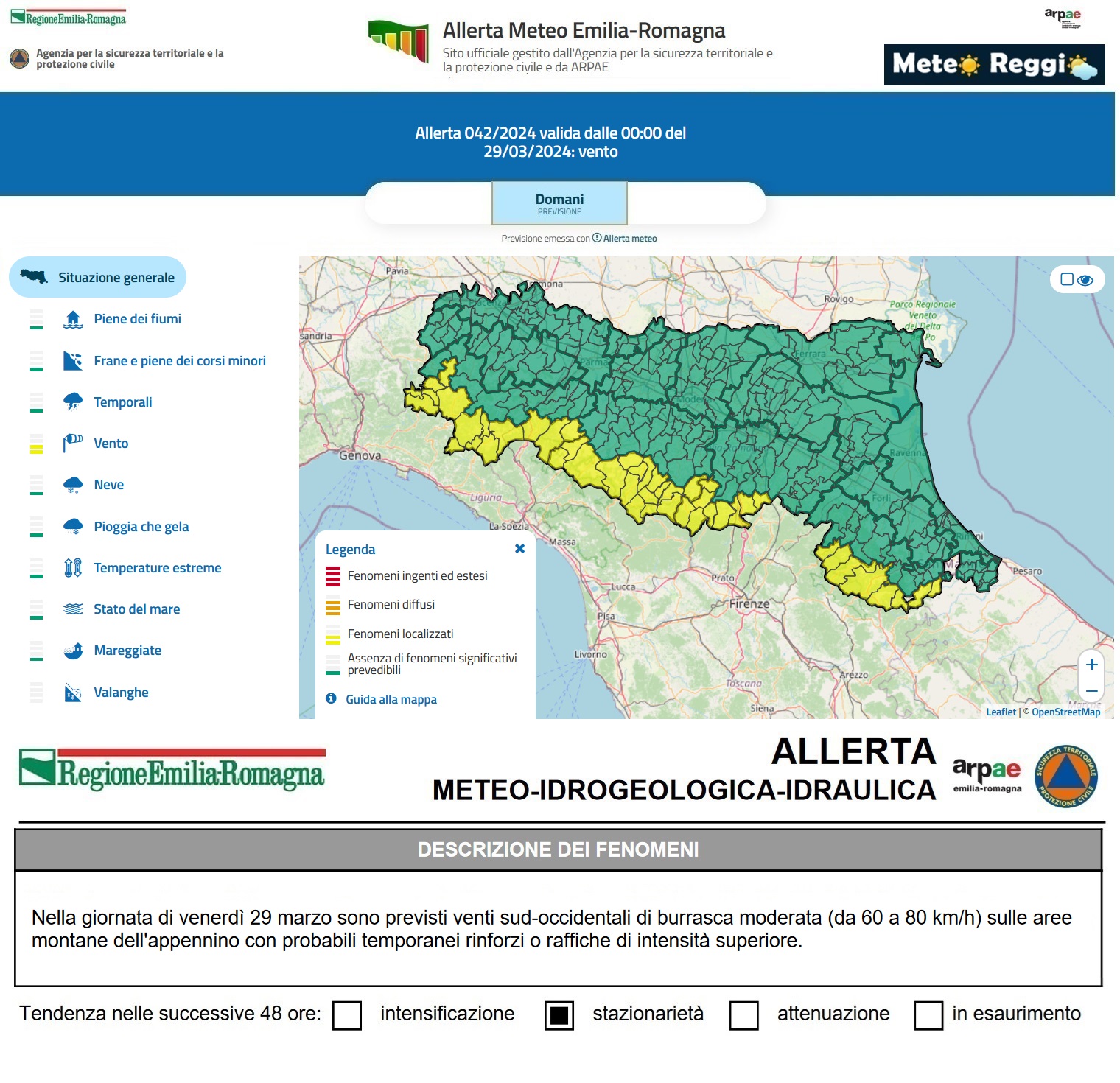 Per tale ragione proseguirà anche per la giornata di domani, venerdì 29 marzo, l'allerta meteo emessa dall'Agenzia per la sicurezza territoriale e la protezione civile e da ARPAE. Questa però scenderà da arancione a 🟡 "gialla" ed interesserà solamente parte della nostra Provincia. Un miglioramento dovuto all'allontanarsi del sistema instabile e ad una sensibile diminuzione del vento.
