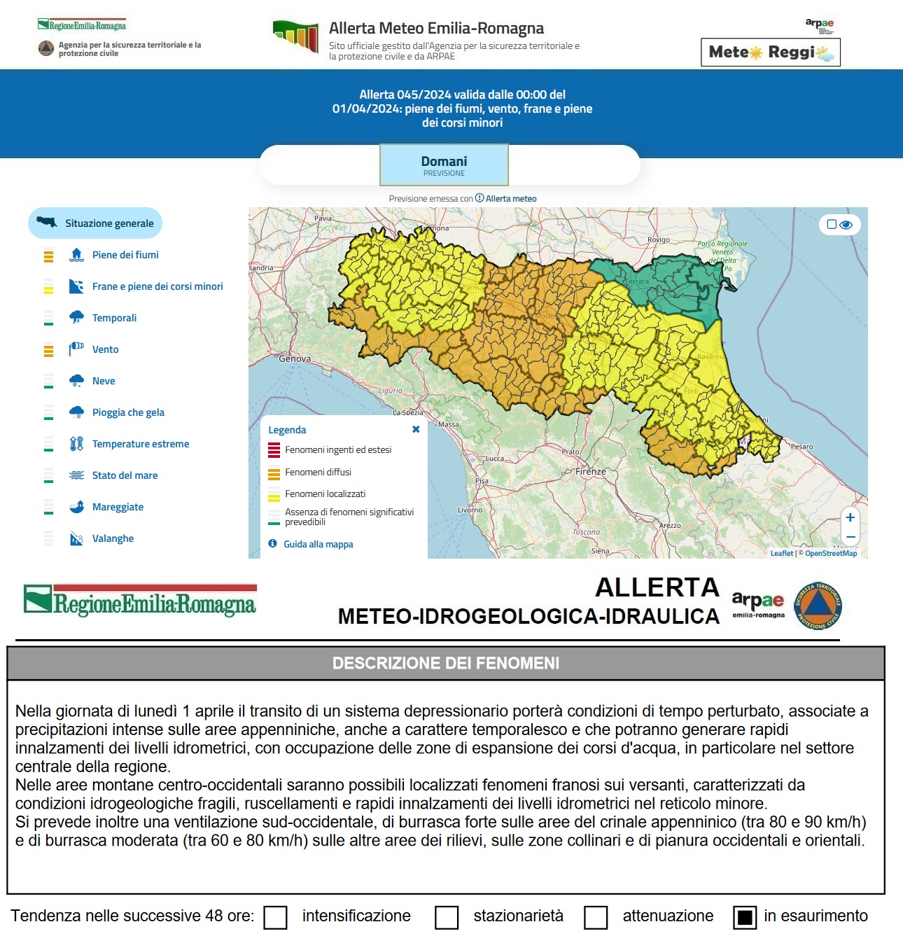 Per tale ragione è stata emessa dall'Agenzia per la sicurezza territoriale e la protezione civile e da ARPAE un'allerta meteo 🟠 "Arancione" valida sull'intero territorio provinciale nella giornata di lunedì 01 aprile.