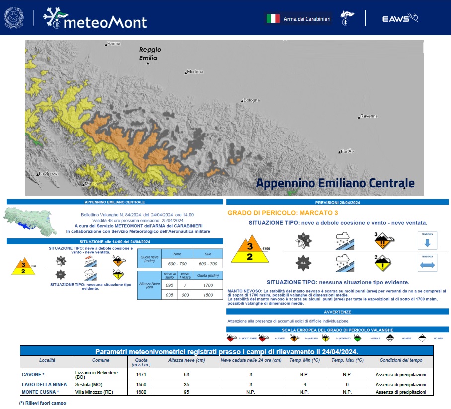Resta a livello 3 "MARCATO" il rischio di valanghe sul nostro Appennino. Valore alto per via del grande apporto di neve che in quota raggiunge i 95. La discesa di aria artica ha favorito l'accumulo di grandi quantitativi di coltre bianca che ancora ricopre il nostro Appennino dagli 800 metri di quota in su. Il vento, poi, ha favorito l'accumulo di quantitativi maggiori nei canaloni.