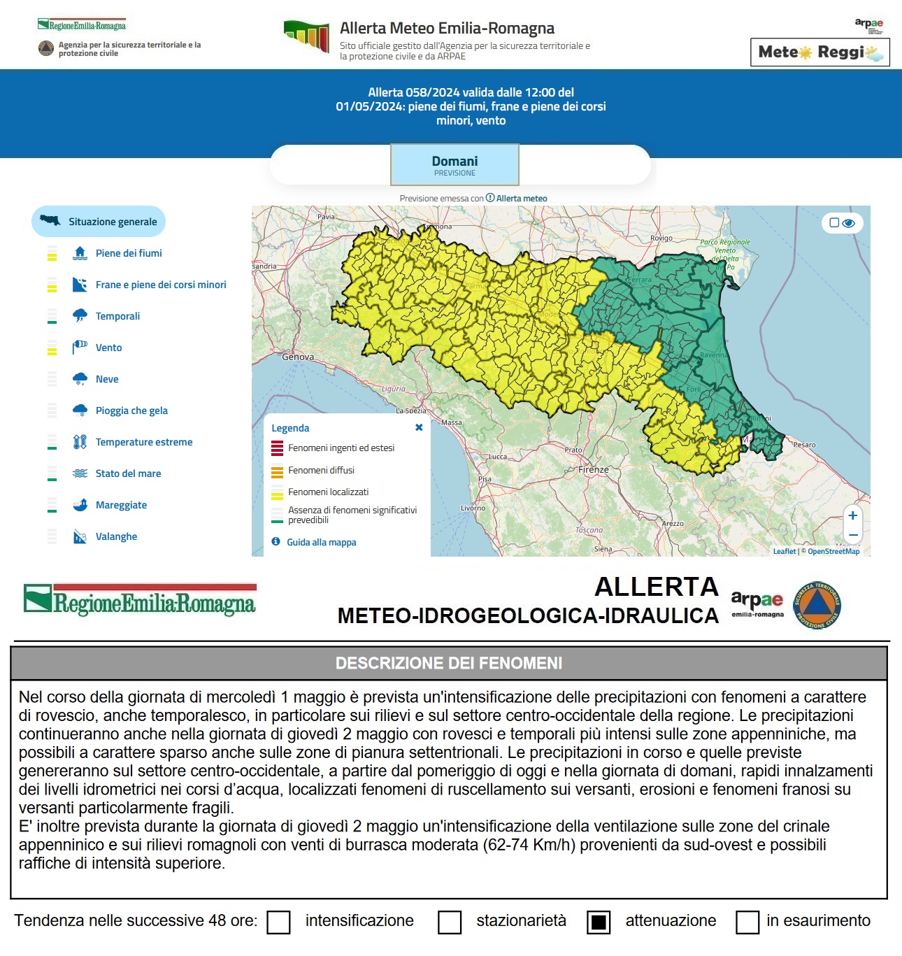 Prima parte della giornata del primo maggio tranquilla, ma dal primo pomeriggio alla notte sono possibili acquazzoni che interessando principalmente l'Appennino potrebbero portare al transito di onde di piena sopra soglia 1 da parte dei corsi d'acqua. Le piogge notturne, poi, faranno sconfinare questa tipologia di allerta anche nella giornata di giovedì 02 maggio.
