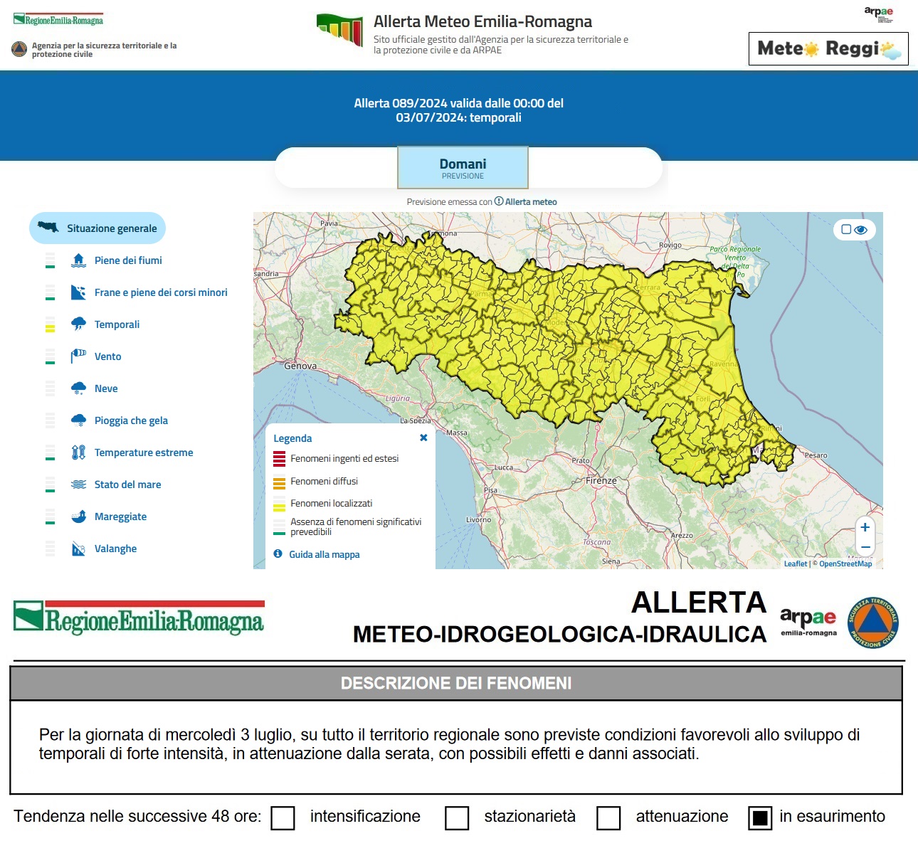 E' stata emessa dall'Agenzia per la sicurezza territoriale e la Protezione Civile ed ARPAE una nuova allerta meteo 🟡 "gialla" che interesserà la nostra provincia in tutta la sua interezza nella giornata di mercoledì 03 luglio.