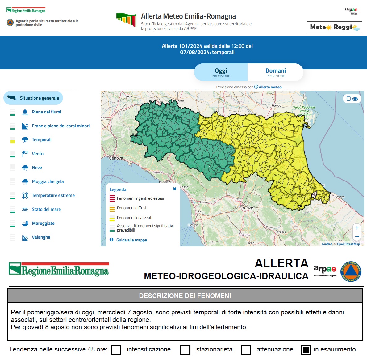 I modelli possibilitistici vedono l'interessamento di quasi tutta la Provincia dal Po fino ai piedi delle montagne, ma l'allerta meteo "gialla" interessa solo le zone di Pianura fino alla via Emilia e Reggio Emilia.