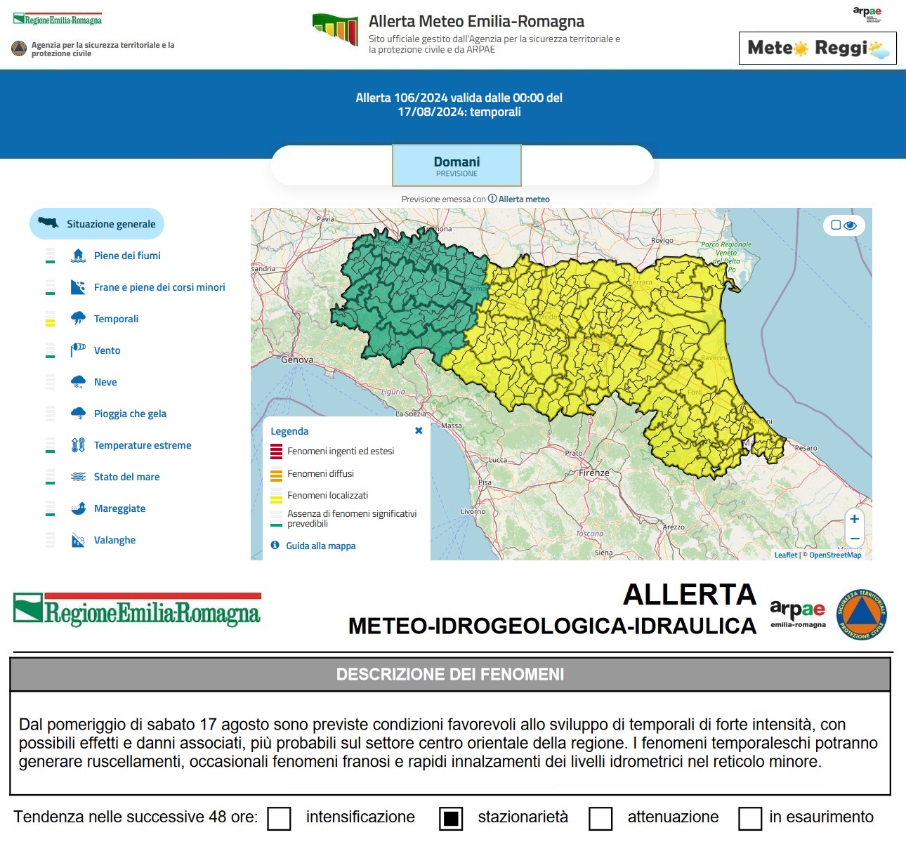 Prevedere dove colpiranno esattamente i temporali è compito arduo, pertanto è stata emessa una nuova allerta meteo 🟡 "gialla" dall'Agenzia per la sicurezza territoriale e la protezione civile e da ARPAE valida su tutto il territorio provinciale.