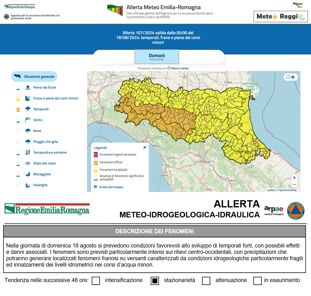 L'allerta meteo "Arancione" per temporali è estesa anche ai 3 Comuni della Montagna che vivranno condizioni simili alla Collina. Le criticità saranno le medesime anche se l'intensità dovrebbe calare salendo di quota. Attenzione al possibile ingrossamento dei corsi d'acqua secondari ed al ruscellamento improvviso e veloce delle piogge meteoriche nei singoli ed isolati eventi di nubifragio localizzati.