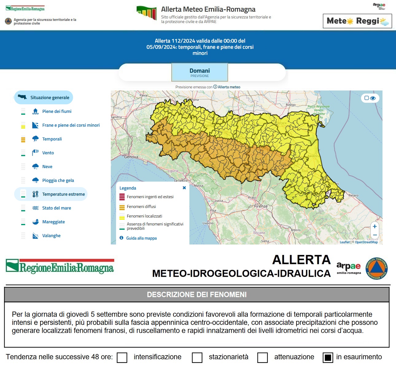 E' stata da poco emessa dall'Agenzia per la sicurezza territoriale e la protezione civile e da ARPAE un'allerta meteo che coinvolgerà l'intero territorio provinciale nella giornata di giovedì 05 settembre. Un'allerta meteo 🟠 "Arancione" per le zone a sud della via Emilia e 🟡 "gialla" per la Città e la Pianura.