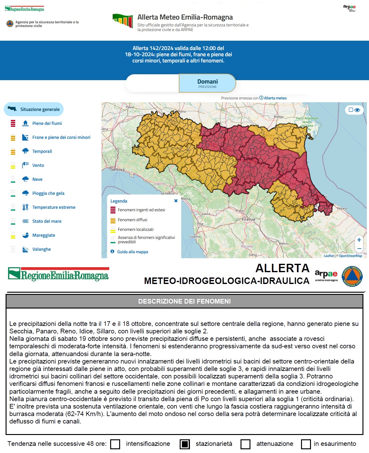 Per tale ragione è stata emessa ed innalzata una nuova allerta meteo dall'Agenzia per la sicurezza territoriale e la protezione civile e ARPAE che sale a livello 🔴 "ROSSO" sulle zone di Pianura e "Arancione" sull'Appennino per la giornata di domani, sabato 19 ottobre.