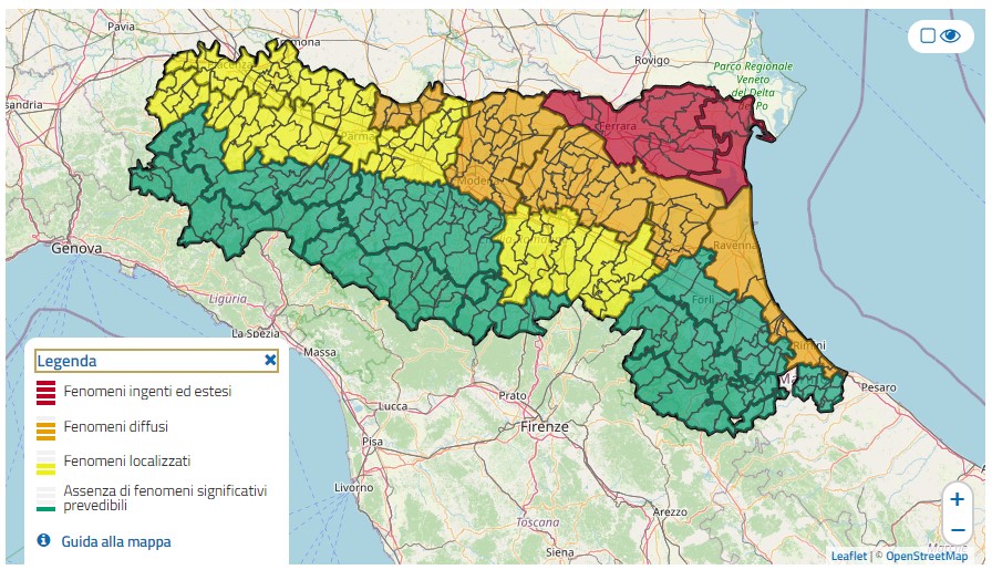 - Pianura e Città: Codice colore giallo – Allerta per il possibile transito di onde di piena dai fiumi appenninici, con livelli che potrebbero avvicinarsi o superare la soglia 2.