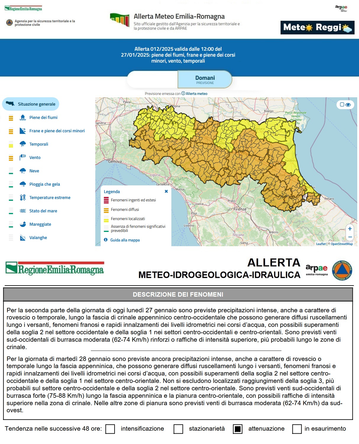 Su tutta l'area avremo allerta meteo "Arancione" nella giornata di martedì 28 gennaio per il rischio che alcuni corsi d'acqua possano superare soglia 2 o 3 nei settori occidentali. Le piogge inizieranno a cadere copiose dopo il tramonto di lunedì 27, con forti venti sud-occidentali di