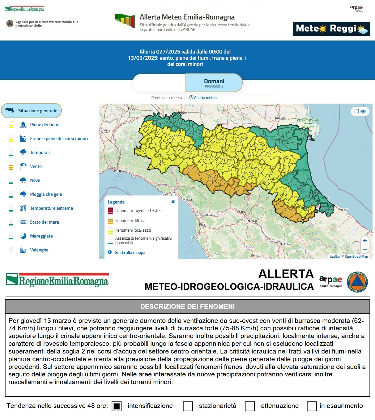 Nella giornata di domani, giovedì 13 marzo il vento soffierà forte sul nostro Appennino e le piogge della sera precedente defluiranno verso valle in corsi d'acqua che potrebbero superare soglia 1 o 2 in alcuni trantti. Per tale motivo è stata emessa una nuova allerta meteo dall'Agenzia per la sicurezza territoriale e la protezione civile e ARPAE che in montagna raggiunge livello 🟠 "Arancione".