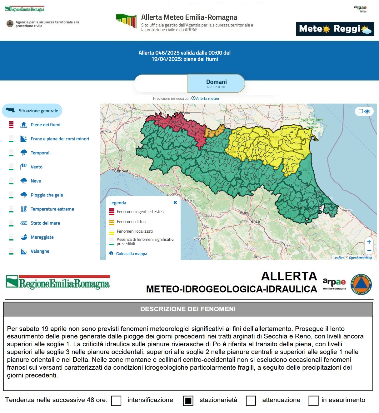 Per tale motivo è stata emessa, dall'Agenzia per la sicurezza territoriale e la protezione civile e da ARPAE, un'allerta meteo "Arancione" che interessa i nostri Comuni rivieraschi del Po. Nella giornata di domani, sabato 19 aprile, è atteso il superamento di soglia 2 su tutta la tratta reggiana in attesa che l'onda passi nella domenica di Pasqua.