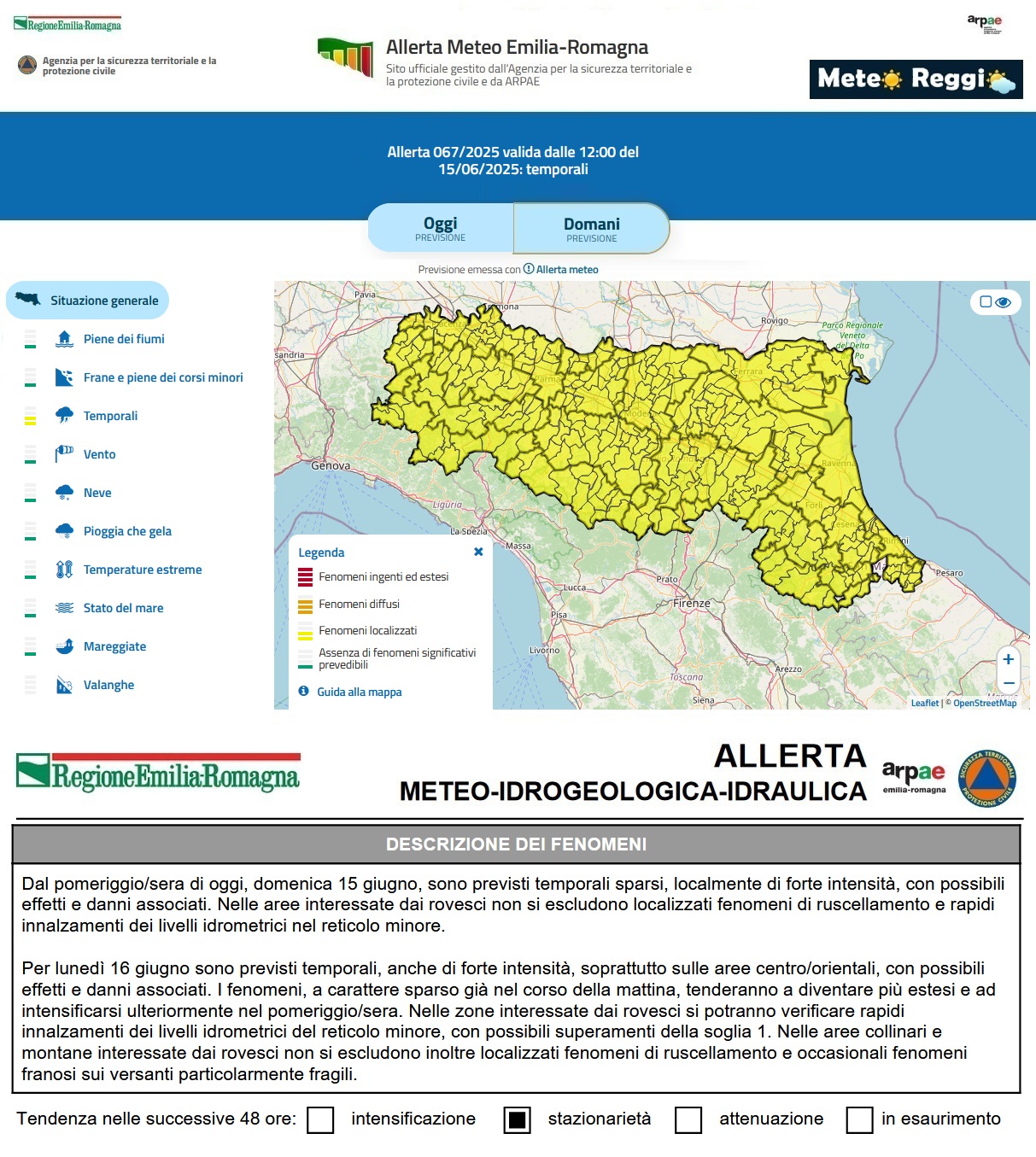 Per tale motivo è stata emessa dall'Agenzia per la sicurezza territoriale e la protezione civile e da ARPAE un'allerta meteo 🟡 "gialla" doppia valida per oggi, domenica 15 giugno e domani lunedì 16 giugno.