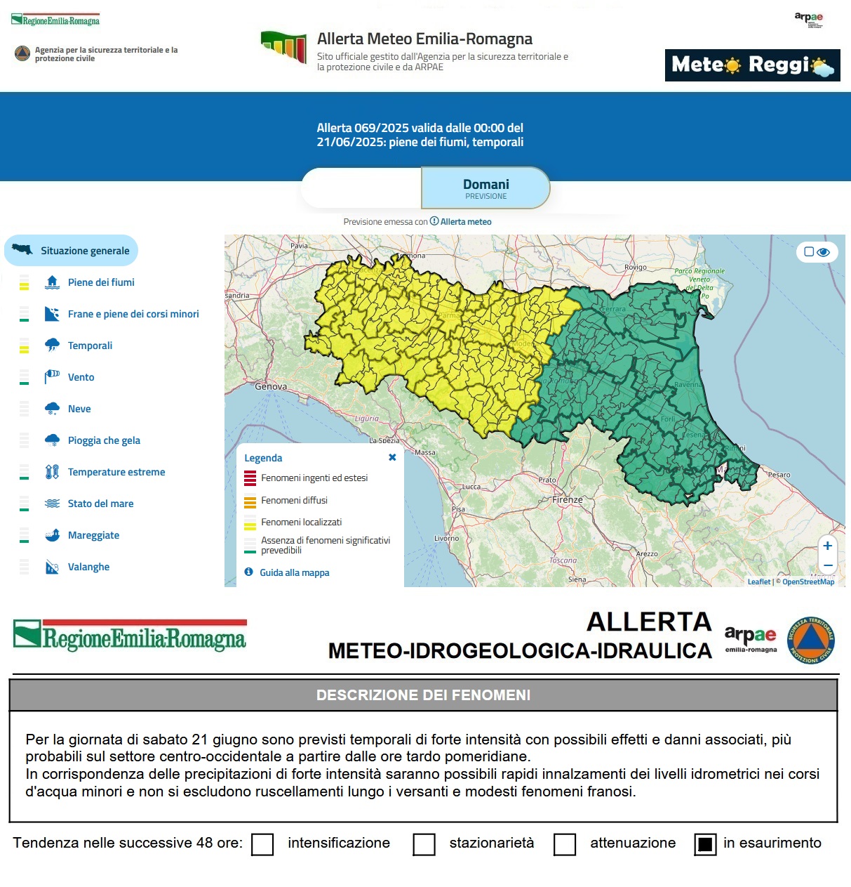 Per questa ragione è stata emessa dall'Agenzia per la sicurezza territoriale e la protezione civile e da ARPAE un'allerta meteo 🟡 "gialla" per temporali che riguarderà l'intero territorio provinciale nella giornata di sabato 21 giugmo