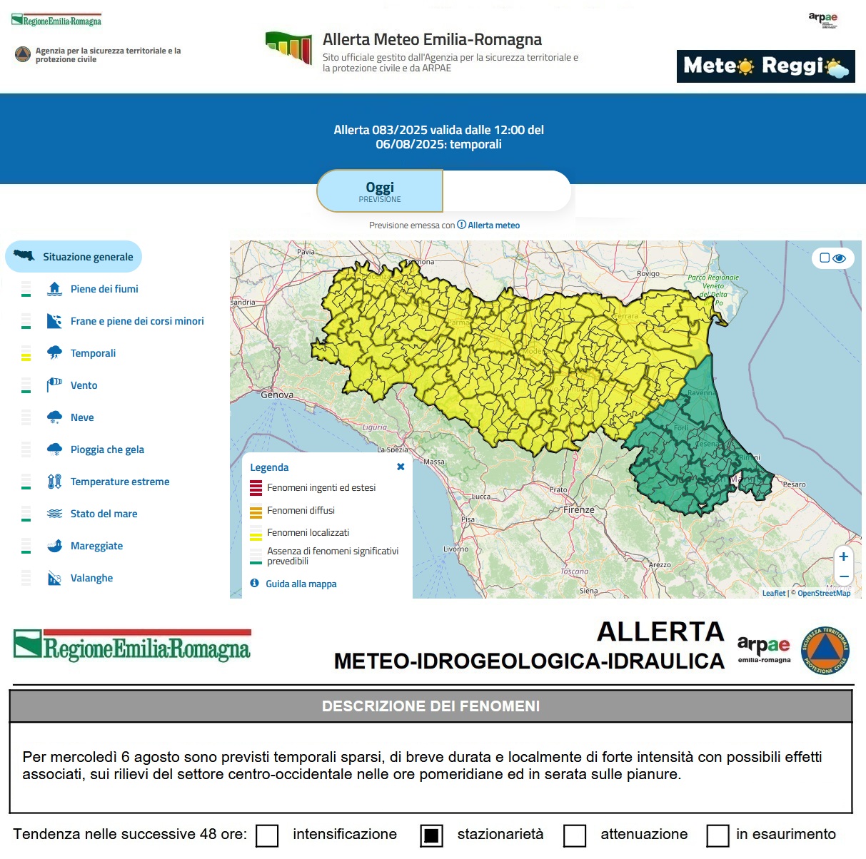 Come accennato nelle nostre previsioni di ieri e di oggi, nell'aria avremo gli ingredienti necessari per la nascita di improvvise celle temporalesche. Tant'è che è stata emessa una doppia allerta meteo "gialla" 🟡 per temporali dall'Agenzia per la sicurezza territoriale e la protezione civile e da ARPAE per la seconda parte della giornata di oggi, mercoledì 06 agosto e per la primissima parte di domani giovedì 07 agosto.