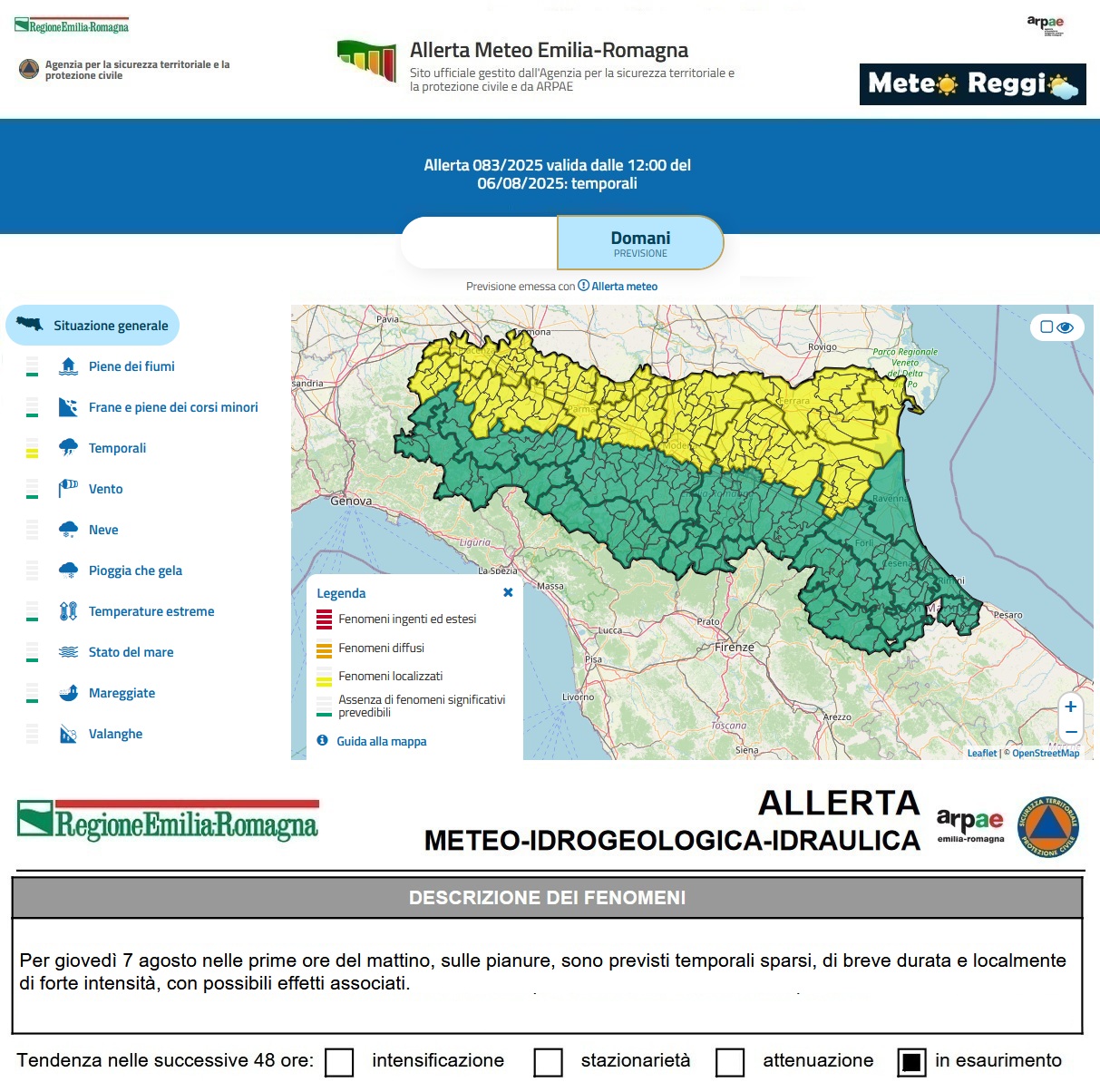 Per la giornata di giovedì 07 agosto non è prevista alcuna allerta anche se sulla Pedecollinare qualche temporale potrebbe sconfinare per un paio d'orette nella nuova giornata.
