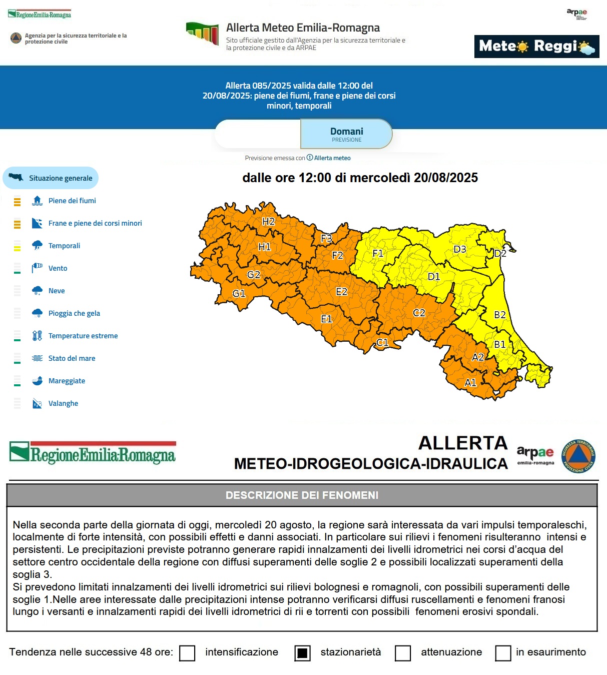 I nuovi modelli previsionali sono meno rosei dei precedenti e questo ha indotto l'Agenzia per la sicurezza territoriale e la protezione civile e da ARPAE ad elevare il livello di allerta meteo dalle 12:00 di oggi, mercoledì 20 agosto, da giallo ad 🟠 "Arancione" e di estendere una seconda allerta anche alla giornata di giovedì 21 agosto quando il quadro generale migliorerà, ma potremmo avere ancora a che fare con la coda della perturbazione in arrivo oggi.