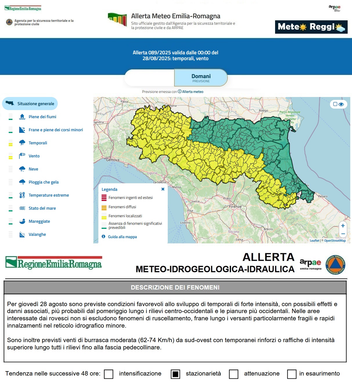 Su tutta l'area avremo allerta meteo "gialla" per temporali e vento forte. Il grosso della perturbazione interesserà soprattutto la Toscana, ma i temporali sconfineranno sicuramente anche nel reggiano. Attenzione alle forti raffiche di vento che raggiungeranno regime di Burrasca moderata dalla Toscana e a tratti anche raffiche maggiori. Possibile ingrossamento dei corsi d'acqua minori come ruscellamento delle piogge.