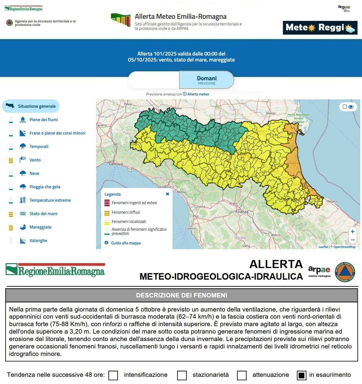 Non sono tanto le piogge a preoccupare le Agenzie, ma il vento forte in caduta che scenderà dal versante toscano verso la Pianura che si scontrerà frontalmente con quello in arrivo da nord. Per tale motivo è stata emessa un'allerta meteo 🟡 "gialla" dall'Agenzia per la sicurezza territoriale e la protezione civile e da ARPAE per la giornata di domenica 05 ottobre.
