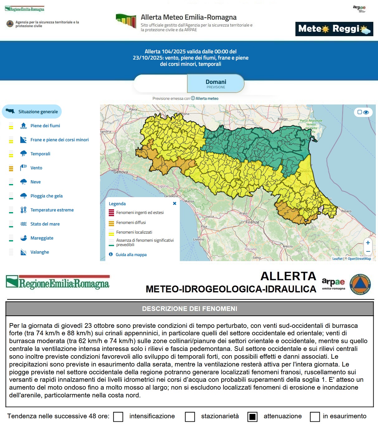 Su tutta l'area avremo allerta meteo "gialla" per via delle forti piogge attese che potrebbero creare qualche scenario di rischio sotto l'aspetto dell'ingrossamento dei corsi d'acqua e la riattivazione di movimenti franosi dovuti al ruscellamento delle acque. Attenzione anche al vento forte di burrasca moderata (tra 62 km/h e 74 km/h) che potrebbe far cadere rami e piante secche.