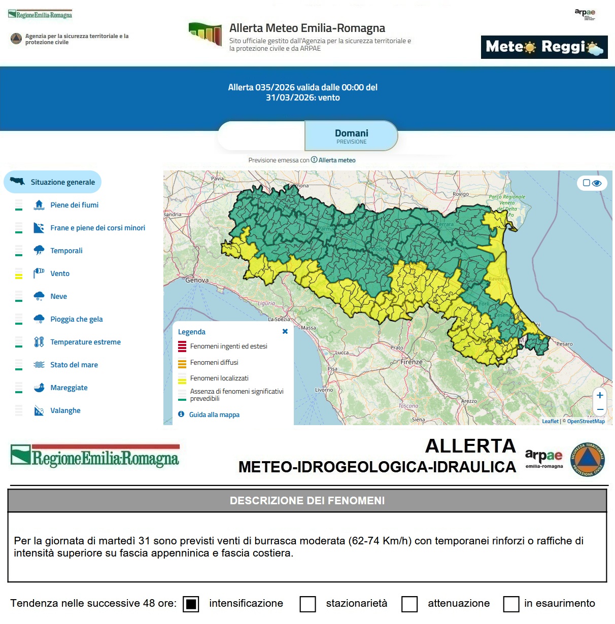 Una nuova doccia di aria fredda scende da nord contro le Alpi. Questa volta senza particolari minacce, ma nella giornata di martedì 31 marzo il vento troverà il modo di scendere dalle valli alpine verso la Pianura. Nel reggiano le raffiche saranno deboli sui settori di Pianura, mentre saranno più intensi tra parmense e piacentino. Per l'effetto "Venturi", però, in Montagna la velocità del vento salirà in modo più intenso tracimando verso la Toscana con raffiche di Burrasca.