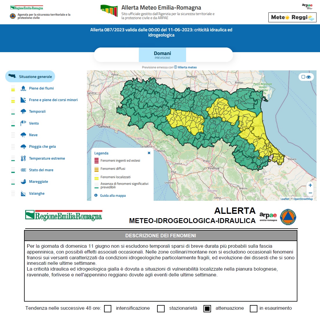 E' stata emessa dall'Agenzia per la sicurezza territoriale e la protezione civile e da ARPAE un'allerta meteo 🟡 "Gialla" per la giornata di domani, Domenica 11 giugno, che interesserà solo una porzione della nostra Provincia. Le piogge che stanno caratterizzando le ultime settimane, infatti, continuano ad appesantire e lubrificare il suolo del nostro Appennino. Ciò favorisce l'innescarsi di movimenti franosi e agevola tutti quelli già in corso.