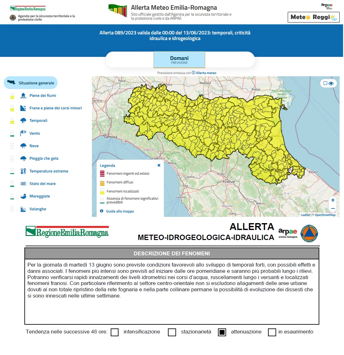 E' appena stata emessa dall'Agenzia per la sicurezza territoriale e la protezione civile e da ARPAE un'allerta meteo 🟡 "Gialla" per temporali valida sul nostro territorio Provinciale per la giornata di domani, martedì 13 giugno.