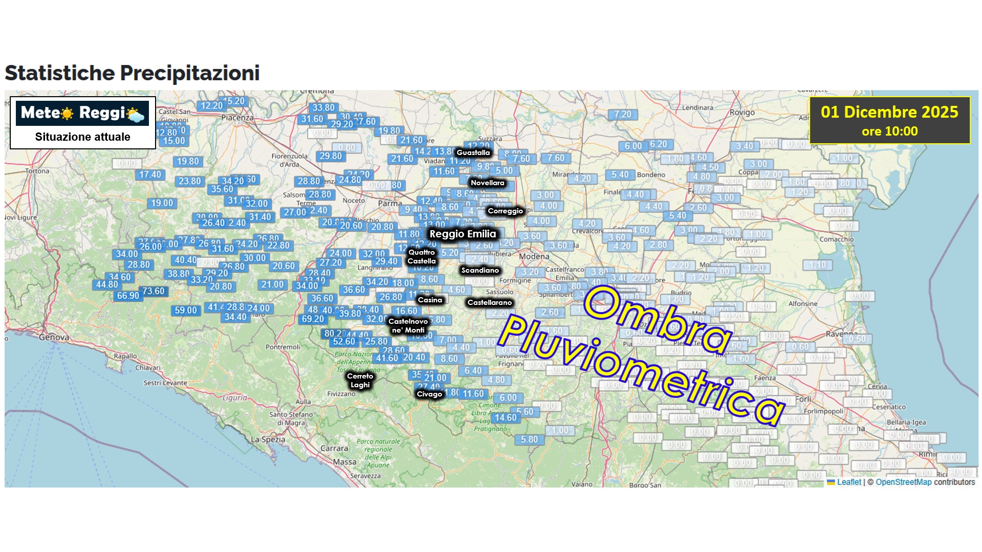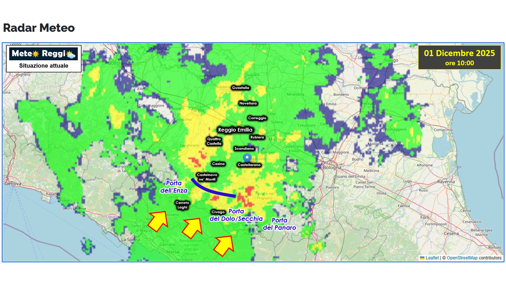 Siamo nel vivo della perturbazione che arriva dalla Toscana e che attraversa il nostro territorio. Il Crinale gioca ancora un ruolo fondamentale, ma le piogge sono ormai diffuse su tutta la provincia. Gli accumuli maggiori sono sul fianco occidentale dove le piogge trovano minor resistenza dall'altezza delle vette e dove la dorsale Succiso-Casarola-Ventasso indirizzano le piogge verso la Pianura.