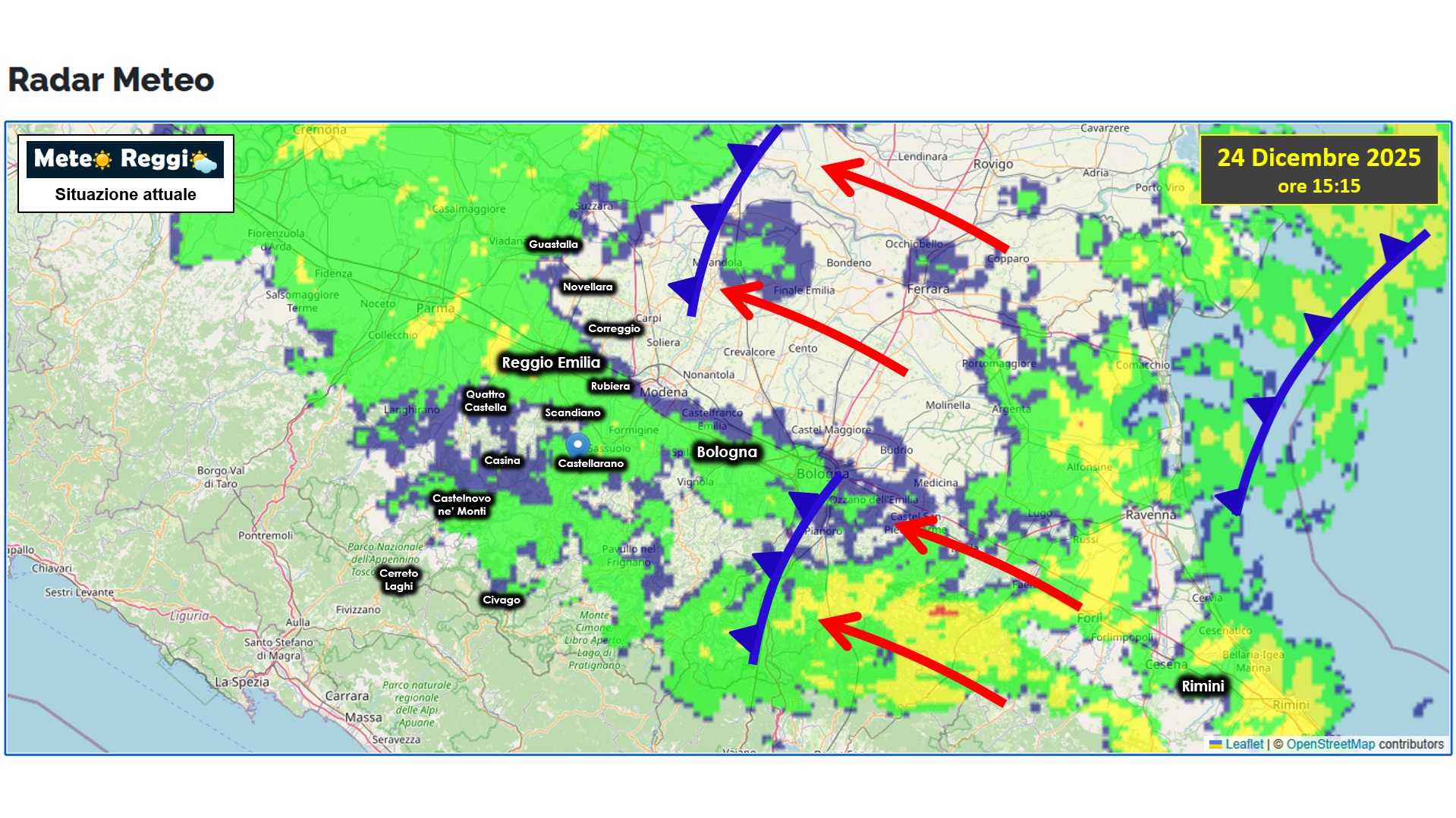 La perturbazione non perde forza, cambia un po' d'inclinazione e questo permette alle temperature del nostro Appennino di distaccarsi da quelle più miti della Pianura. I flussi di vento di Scirocco corrono paralleli alla Via Emilia e tengono i valori attorno ai 5°C contro gli 1°/2°C della Collina e Montagna.