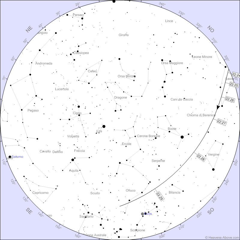 Se poi vogliamo strafare e siamo fortunati, alle 22:38 nella medesima posizione a sud-ovest vedremo transitare un trenino di satelliti Starlink!