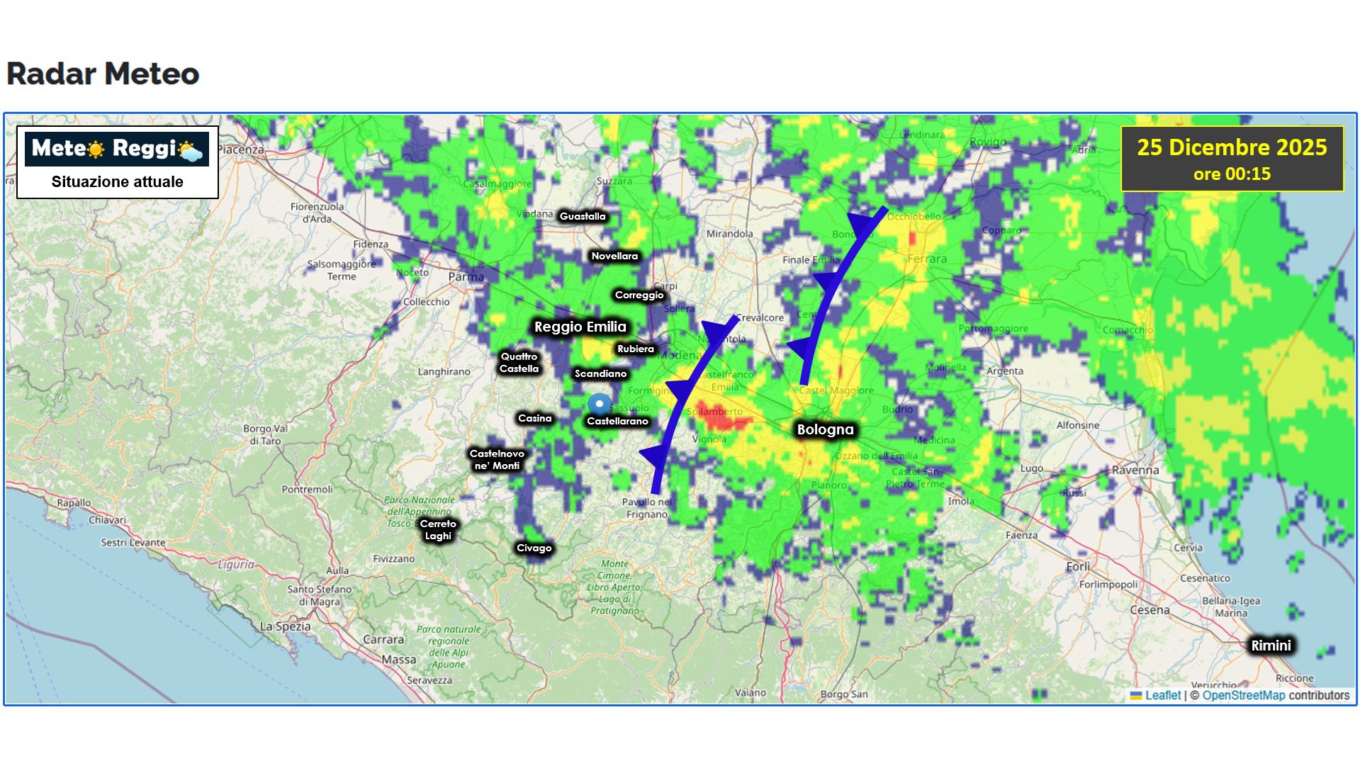 La perturbazione di Natale è ancora viva e vegeta, non perde forza più di tanto e continua a portare piogge copiose su tutta la fascia mediana del nostro territorio. Nel comprensorio ceramico, a Scandiano, si superano i 70 mm di accumulo da inizio piogge, mentre lungo il Crostolo si viaggia sopra i 60 mm. Flussi d'aria umida continuano ad arrivare dall'Adriatico, colpa del vortice di bassa pressione che ruota tra il sud della Francia e la Corsica. Questa scaglia aria fredda, si, ma non a sufficienza e il tutto si traduce in una neve "patocca" poco efficace sotto l'aspetto degli accumuli e molto bagnata.