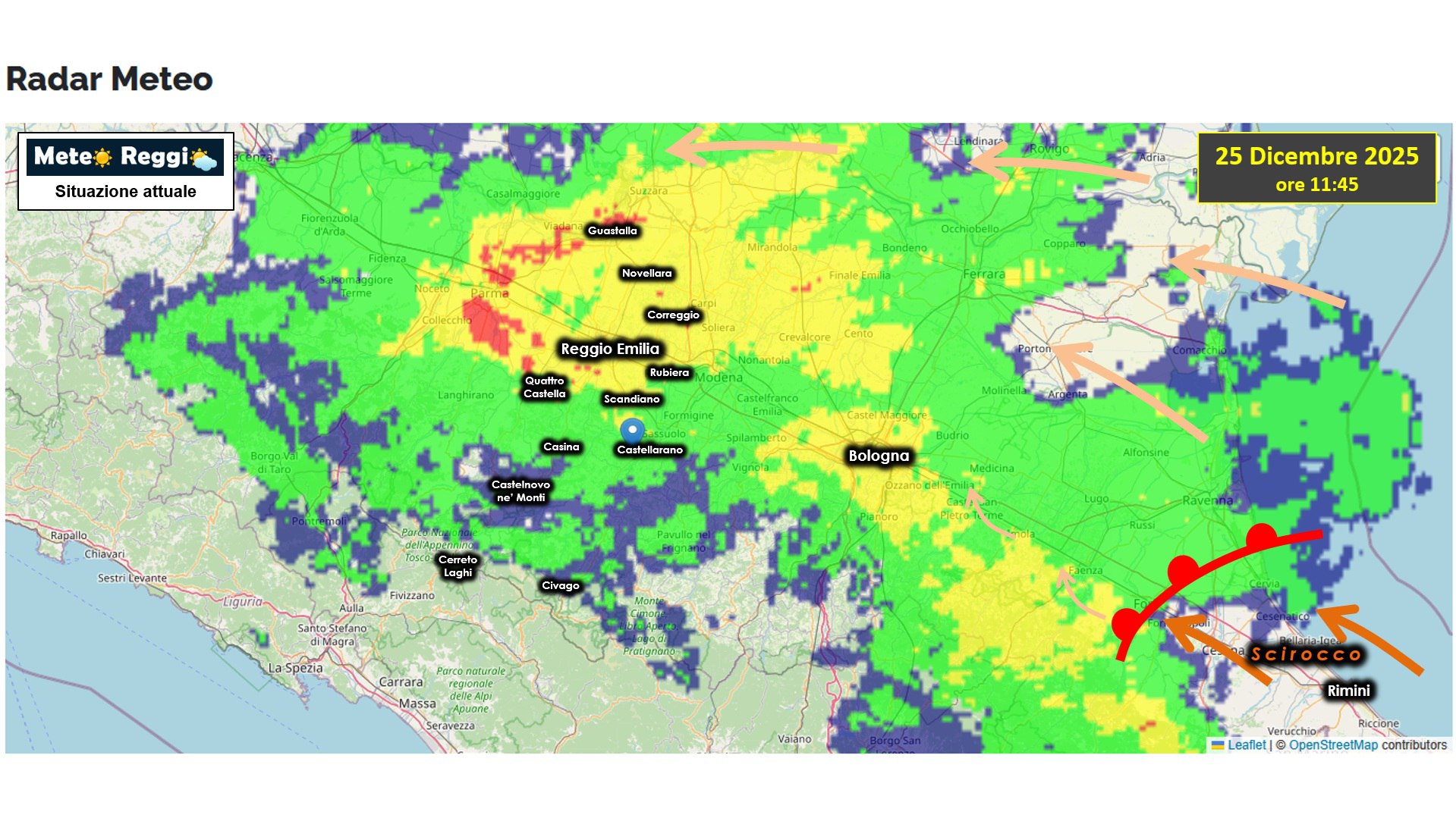Provincia divisa in due tra pioggia e neve. In Pianura abbiamo forti piovaschi dal Po fino alla Pedecollinare, mentre oltre i 500 metri nevica copiosamente. Una neve molto bagnata che sotto l'aspetto dell'accumulo lascia molto a desiderare, ma ugualmente in grado di complicare la viabilità sulle strade.