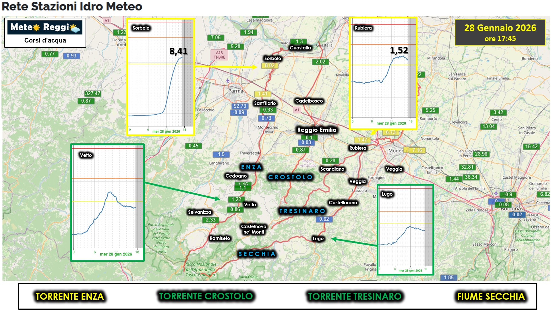 Tresinaro e Crostolo hanno fatto registrare dei sussulti prima di mezzogiorno ma ampiamente sotto soglia 1.