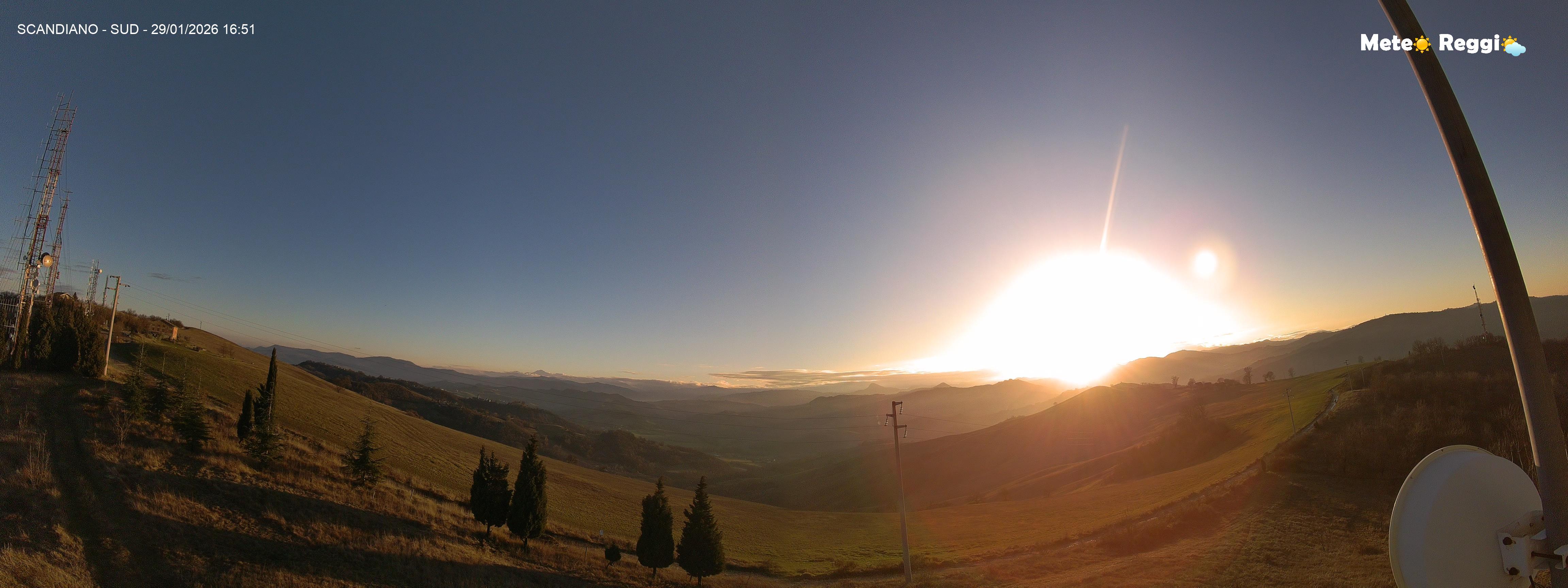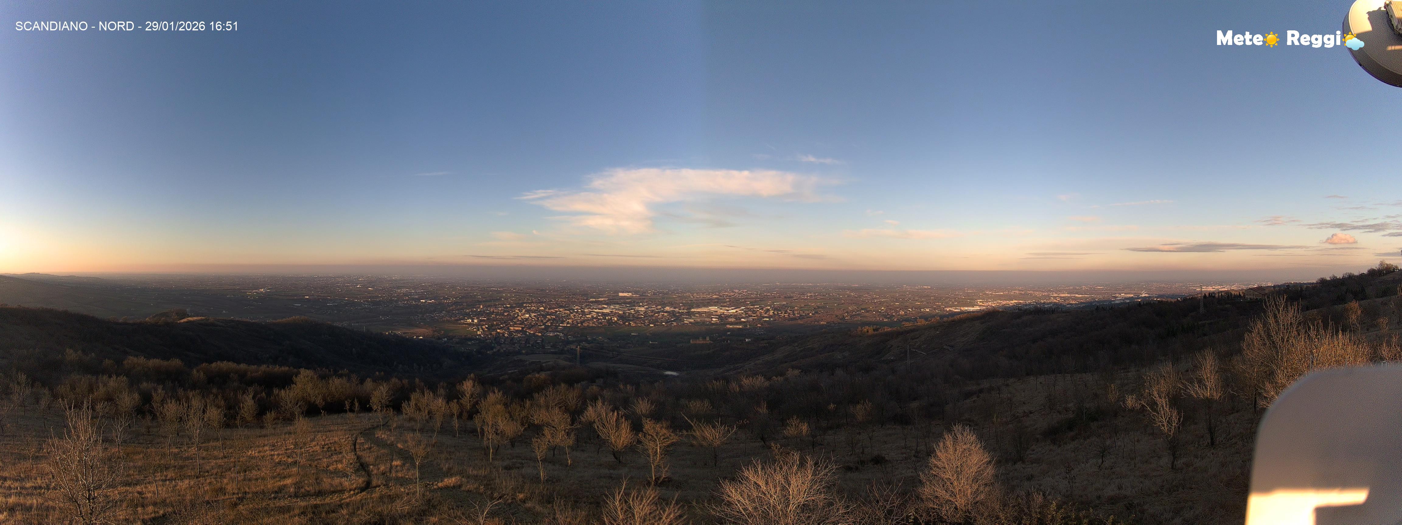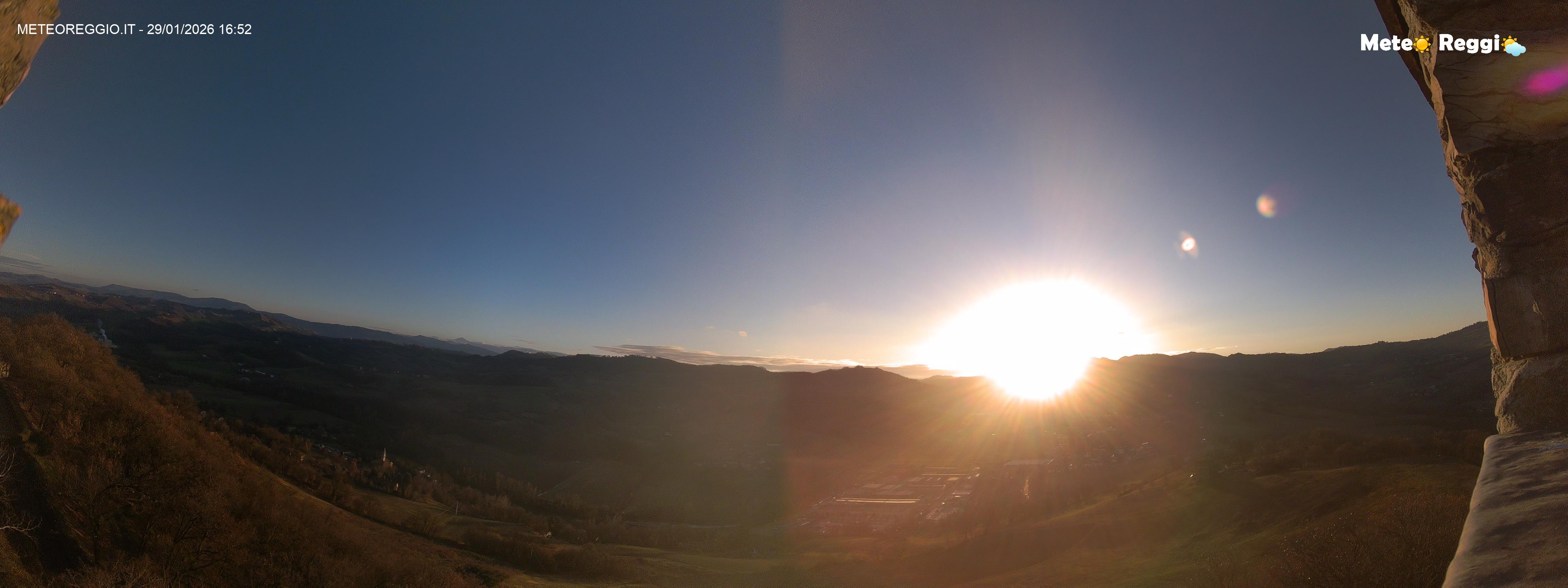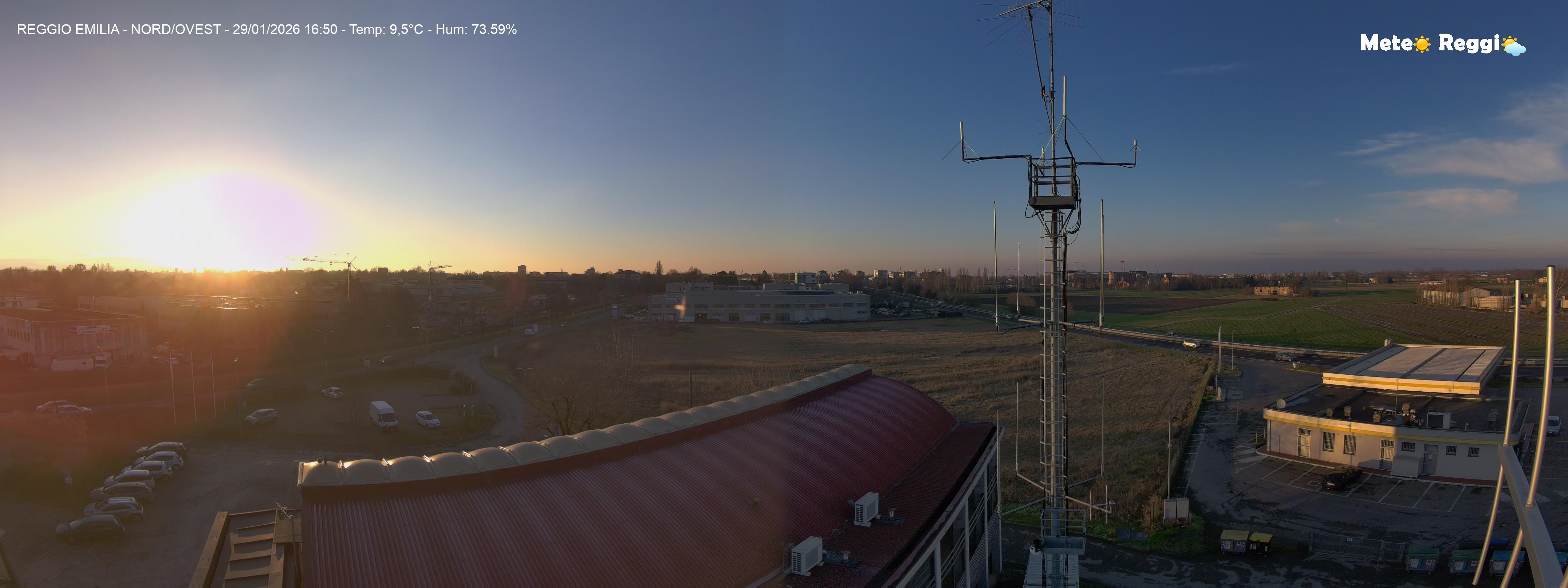 Discreto ribaltamento del tempo rispetto a questa mattina. Cielo praticamente sereno su tutto il reggiano e di nuovo un gran bel tramonto su tutta la Provincia, solo in Montagna abbiamo ancora un cappello di nuvole basse che coprono il cielo. Durante le ore centrali è caduta un po' di neve, ma ora la protagonista è la nebbia che riduce la visibilità.