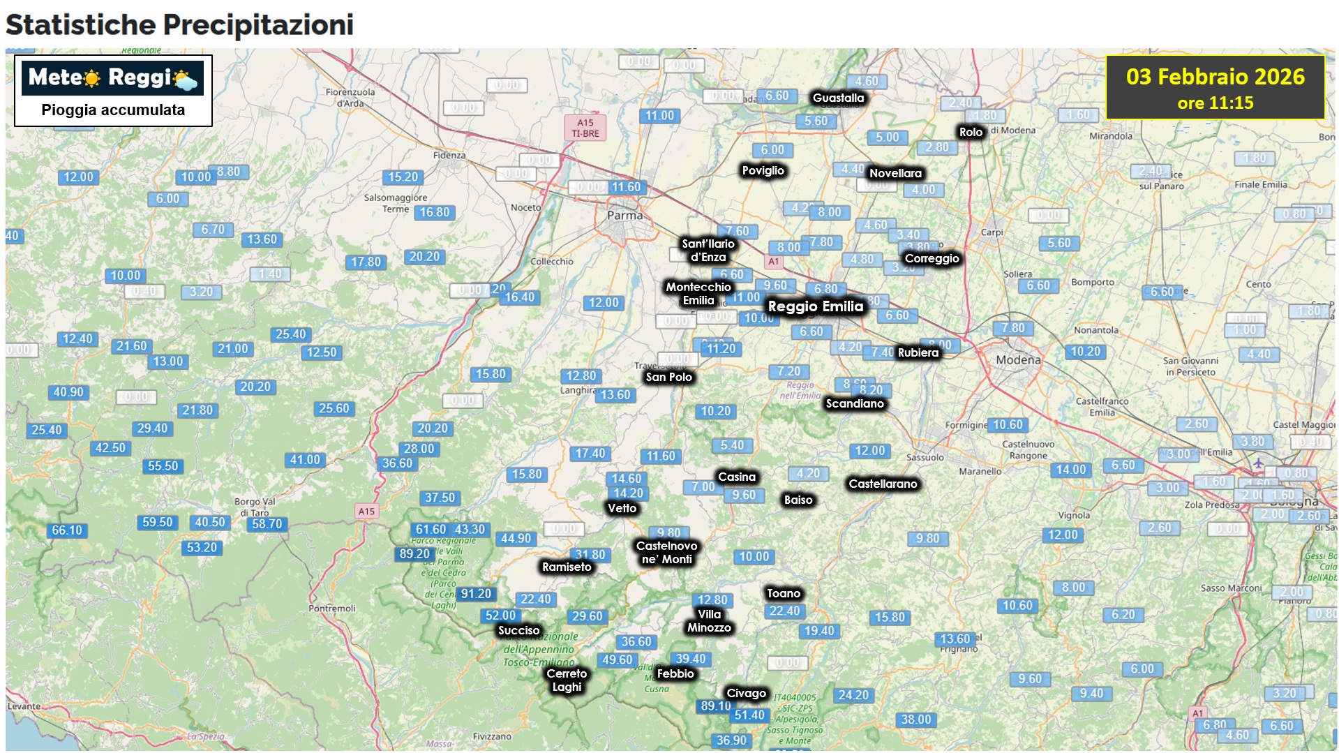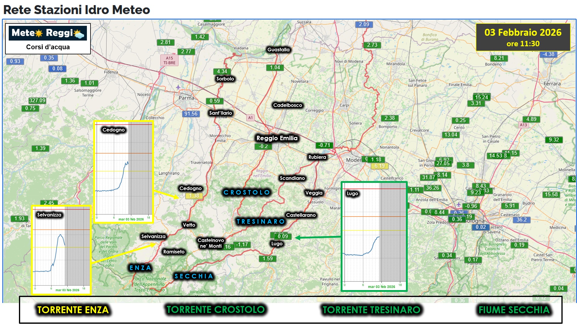 Questi fattori hanno portato ad una fisiologica crescita dei corsi d'acqua reggiani, specie quelli che scendono dalla Montagna come Secchia ed Enza e proprio quest'ultimo è il corso d'acqua che supera soglia 1 nel suo alto corso.