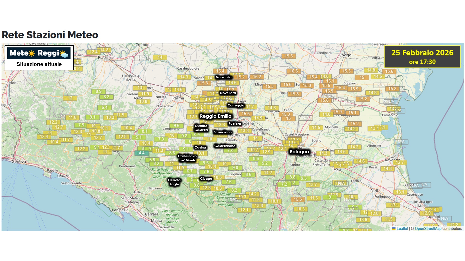 Torna ad aprirsi il cielo tra il Po e la Via Emilia, ma permangono ancora molte nuvole sul nostro Appennino fino alla Pedecollinare. Nuvole basse che rendono grigia l'atmosfera e che in alcune zone limitano la visibilità a banchi come nebbia. In Montagna il Sole è riuscito ad esprimersi bene, ma le temperature sono state di tutt'altro genere rispetto a ieri, quando ad Ospitaletto si toccavano i 17°C. Oggi i valori sono calati di ben 9°C in alta Montagna per l'assenza del vento di Garbino.