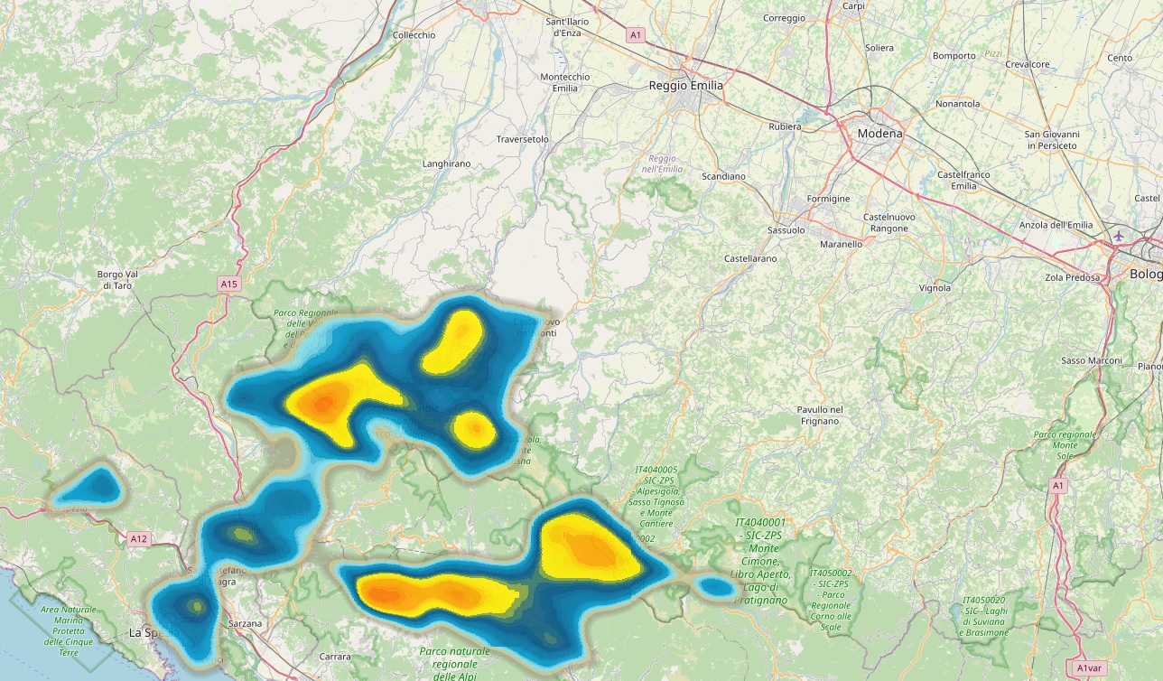 Fin dal primo mattino abbiamo un denso muro di Stau sulle zone di Crinale, mentre sull'alta Collina abbiamo piogge frammentate che a tratti assumono carattere di acquazzone. Si tratta di eventi sparsi a macchia di Leopardo, ma con un lento movimento a scendere in direzione nord-est.
